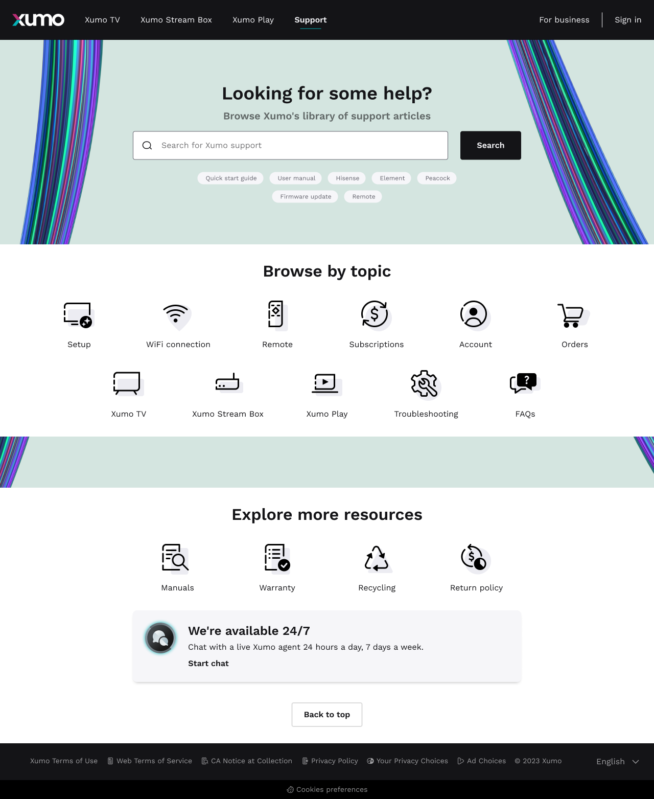 Redesigned the entire Xumo support site to reflect new branding and scale IA to include more content and products